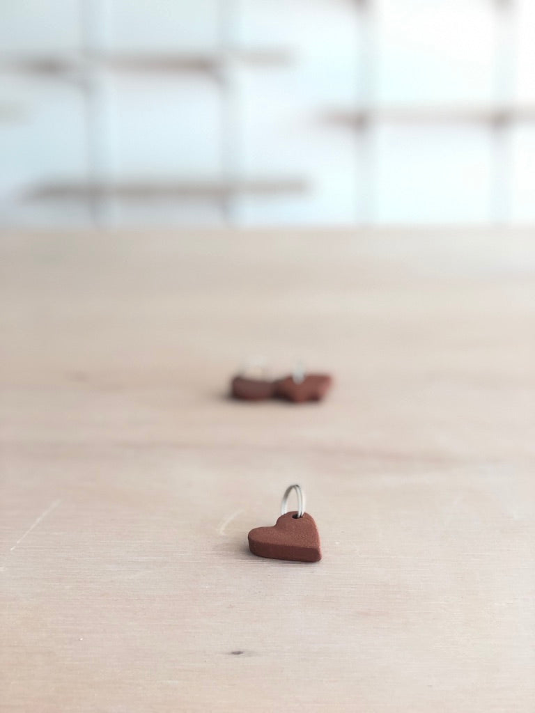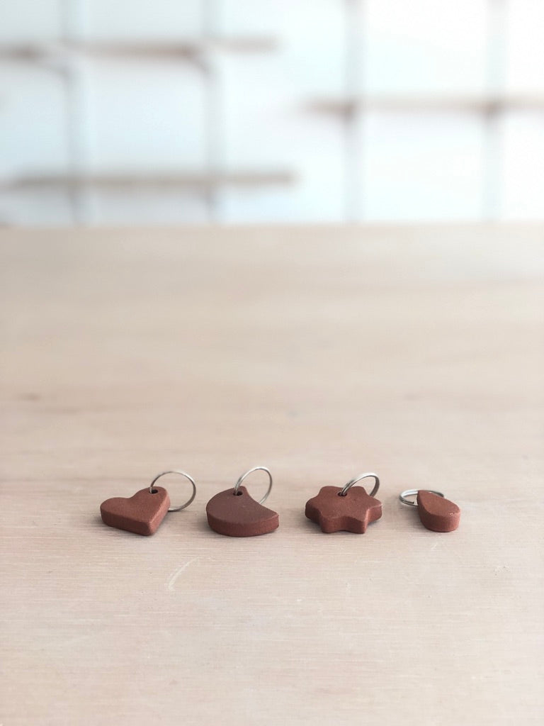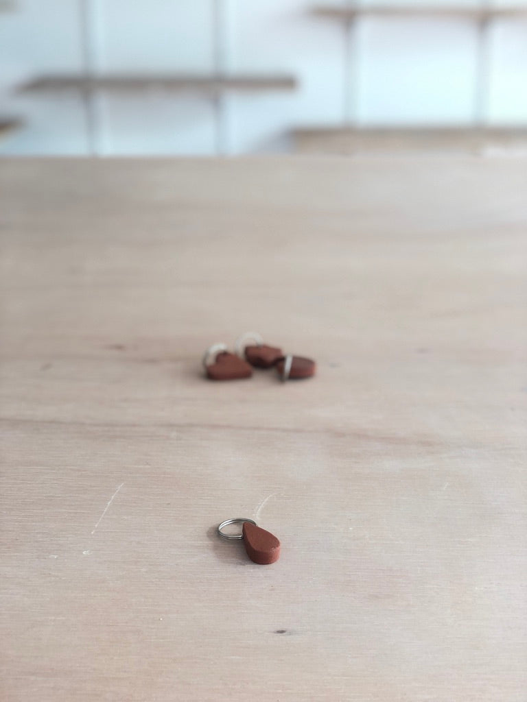 Sleutelhangers in rode klei, niet geglazuurd.